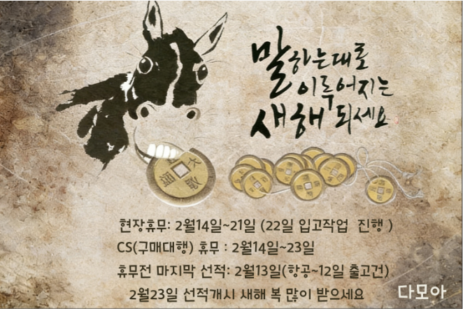 빠른 입출고를 위하며 모든 문의는 신청서 하단의 주문문의 또는 카톡으로만 가능합니다! 기다려주시면 순차적으로 답변 드리겠습니다. 평일(월~금) : 09시~17시 / 점심 : 13시~14시 토.일요일 및 공휴일 휴무