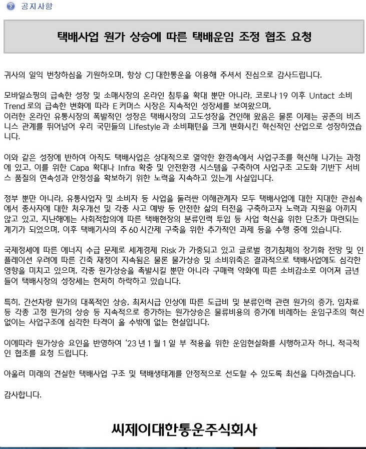 2023년 1월부로 CJ택배 운임 인상 부분 안내드립니다.
